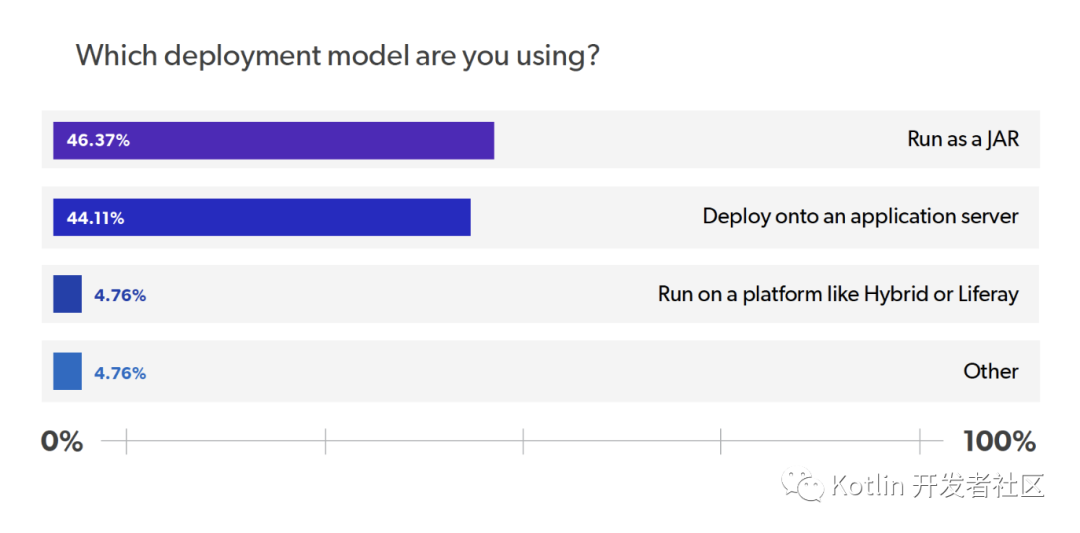 In this question, we asked respondents to tell us which deployment model they use. The most popular deployment model, at 46%, was to run the application as a JAR. 44% of respondents reported deploying onto an application server, while 5% of respondents reported using a platform like Hybris or Liferay to deploy their application.