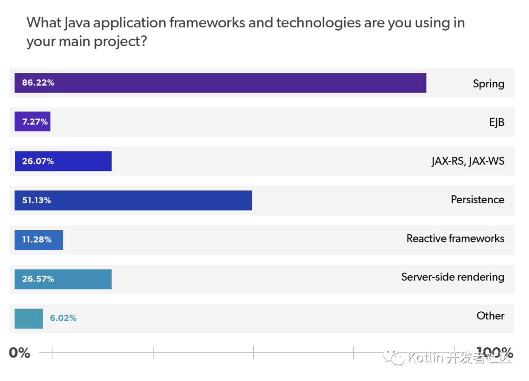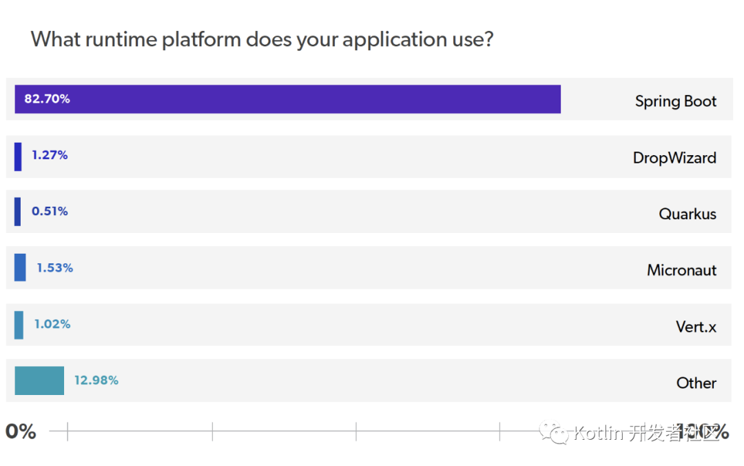 服务器端也被 Spring 主导,其中 Spring Boot 占据一半的市场份额,另有近 1/3 的市场采用 Spring MVC。