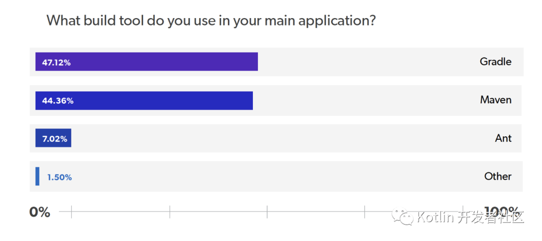 For build tools, we asked developers to pick the tool they use on their main application. Expectedly, Maven and Gradle were the most-used tools. But, perhaps reflecting the amount of respondents working in mobile development, Gradle was the more popular of the two. We don’t think that this reflects the reality of Maven vs Gradle adoption — but it’s interesting to see, regardless. Our survey found that 47% of respondents were using Gradle as a build tool for their main application, while 44% were using Maven. Ant usage trailed both at 7% of respondents.