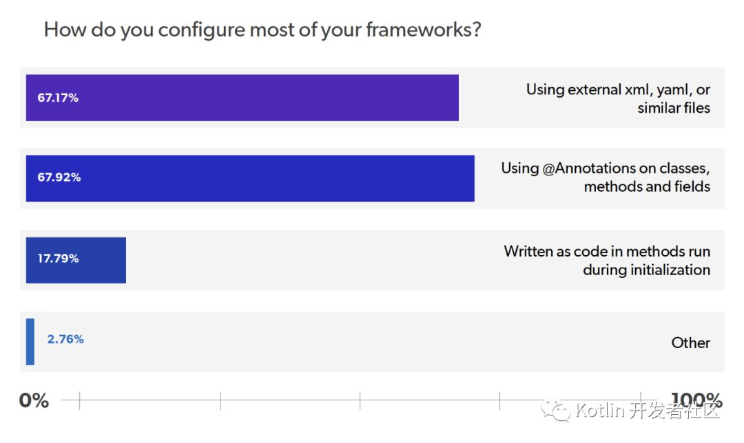 For framework configuration, we found that most respondents were using @Annotations on classes, methods, and fields, or using external xml, yaml or similar files. 68% of users reported using @Annotations, with 67% of users using external xml, yaml, or similar files. 18% of respondents were configuring with code added to methods that run during initialization.