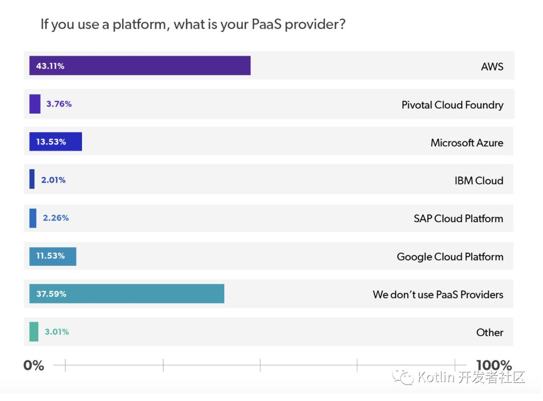 In this question, we asked respondents to select which PaaS provider they used. Of the 60% of respondents using a PaaS provider, 43% use AWS, 14% use Microsoft Azure, and 12% use Google Cloud Platform. Lesser-used providers included Pivotal Cloud Foundry at 4%, with SAP Cloud Platform and IBM Cloud at 2% each.