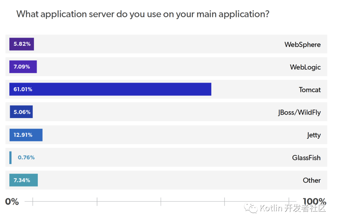 Is application server variety dying? Our survey results show that developers are using Tomcat at nearly five times the rate of the closest competitor. With 61% percent of respondents using Tomcat on their main application, it’s clear that Tomcat is the dominant application server. Indeed, the next highest application server was Jetty at 13%, with WebLogic and WebSphere at 7% and 6% usage respectively. Lastly, JBoss/Wildfly usage came in at 5%.