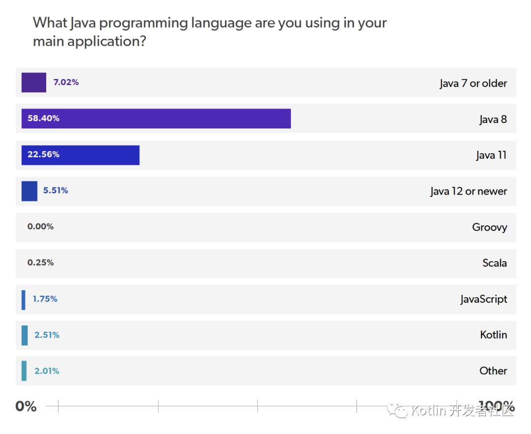 毋庸多说,大多数 JVM 用户(9/10)使用 Java 作为主要语言。今年,Kotlin 大受欢迎,从去年的 2.4% 使用率增长到了 5.5%。
