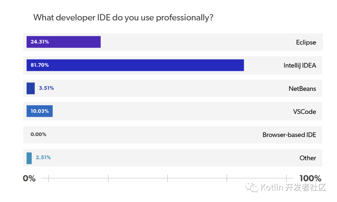 目前,IntelliJ IDEA 是 JVM 社区中使用最广泛的 IDE,有 62% 的开发人员都在使用它。对大量现成功能的支持以及对 Kotlin 的原生支持,促使 IntelliJ IDEA 越来越受欢迎。排在第二的 EclipseIDE 从去年的 38% 下降到今年的 20%。Apache NetBeans 稳居第三,市场份额为 10%,与去年大致相同。