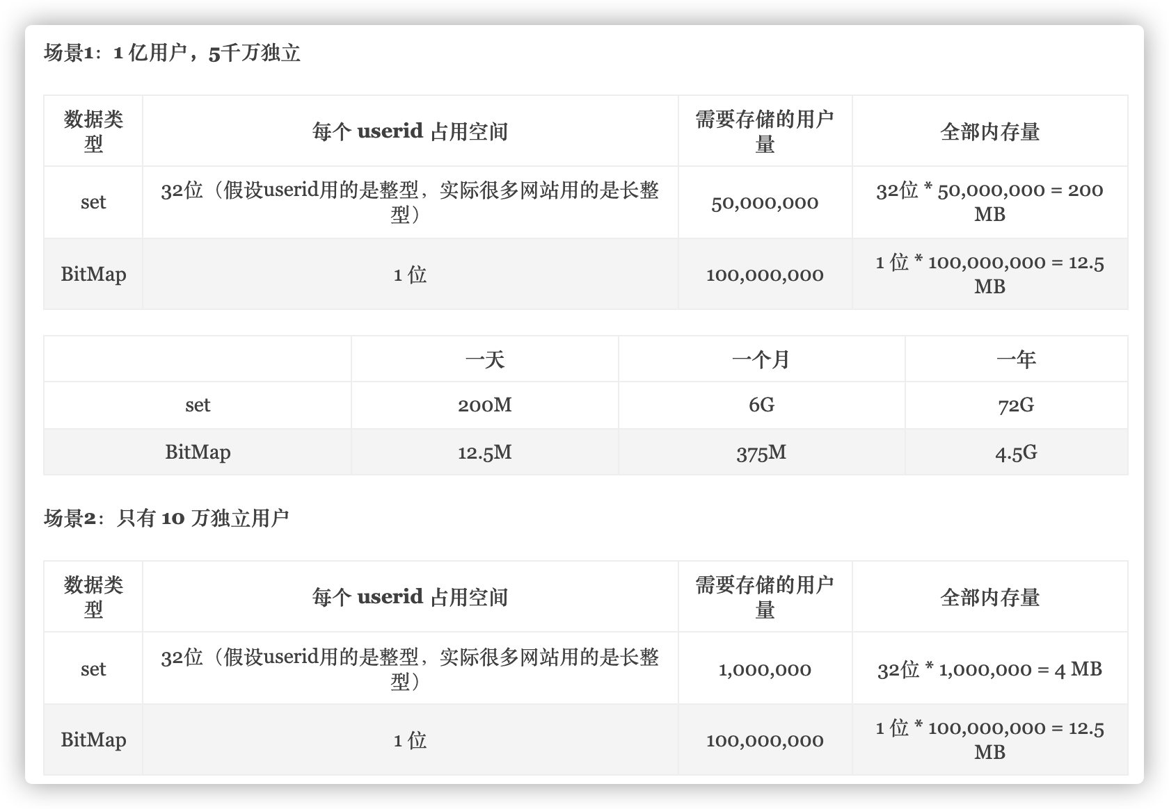 假设当前站点有 5000W 用户,那么一天的数据大约为 50000000/8/1024/1024=6MB