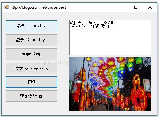 3、 PrintDocument1.DefaultPageSettings.PaperSize = ps,将打印页面大小设置为我们的设置值。