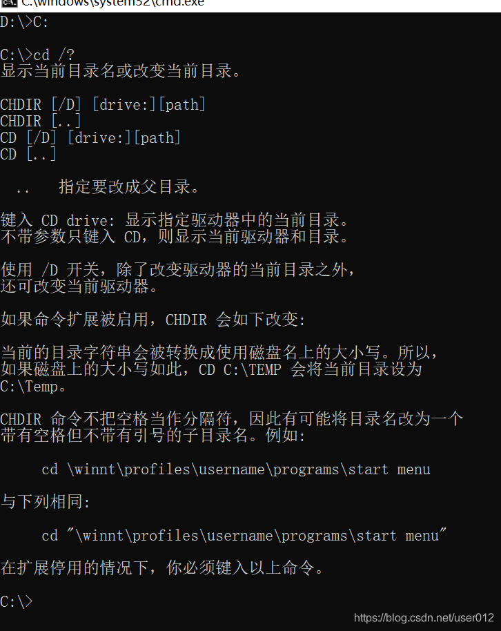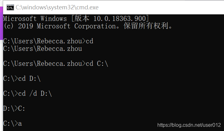 2.关于盘符,我的电脑有C、D、E盘,打开cmd窗口,默认路径是用户文档路径,是C盘下的一个路径,如果想要切换到任何一个C盘下的路径,输入cd 路径是可行的;
