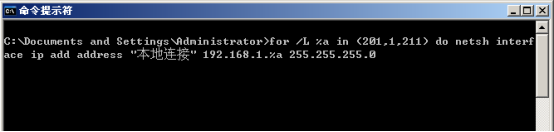 for /L %a in (201,1,211) do netsh interface ip add address "本地连接" 192.168.1.%a 255.255.255.0 如图所示: