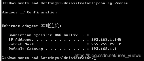 然后通过ipconfig /renew命令向DHCP服务重新获取IP地址。