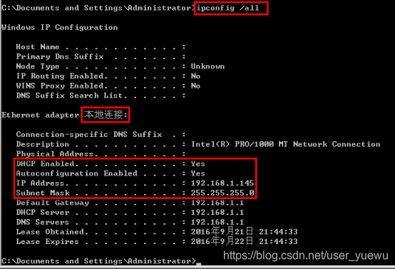如果计算机的网卡配置为自动获取IP地址(DHCP),则会显示与上图类似的信息,其中Ethernet adapter后面显示的是网络连接的名称,如上图所示,这台计算机有一个网络连接,其名称为”本地连接”,在下方显示了这个网络连接的地址信息,其中包括IP Address,是这个网络连接(网卡)的IP地址,Subnet Mask则是这个IP地址的子网掩码。