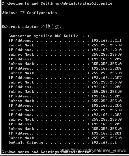 步骤五:再次输入ipconfig查看IP地址配置,如果没有什么意外情况发生,应该会显示类似下面的结果。
