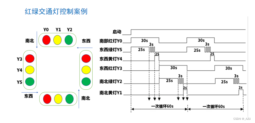 根据案例写PLC程序-红绿灯控制 案例:1、南北方向红灯以30s点亮30s熄灭的时间循环;2、在点亮南北方向红灯的同时点亮东西方向的绿灯,并在点亮25s后,以0.5s熄灭0.5s点亮的时间循环3次后熄灭;3、在东西方向绿灯熄灭后,东西方向黄灯点亮2s后熄灭;4、在东西方向黄灯熄灭后,东西方向红灯点亮30s后熄灭;5、在点亮东西方向红灯的同时点亮南北方向绿灯,并在点亮25s后,以0.5s熄灭0.5s点亮的时间循环3次后熄灭;6、在南北方向绿灯熄灭后,南北方向黄灯点亮2s后熄灭。