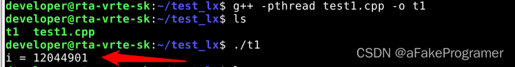 代码的第8行定义了一个原子类型(int)变量i,在第13行多线程修改i的时候即可免去加锁和解锁的步骤,同时又能保证变量i的线程安全性。代码运行结果如下: