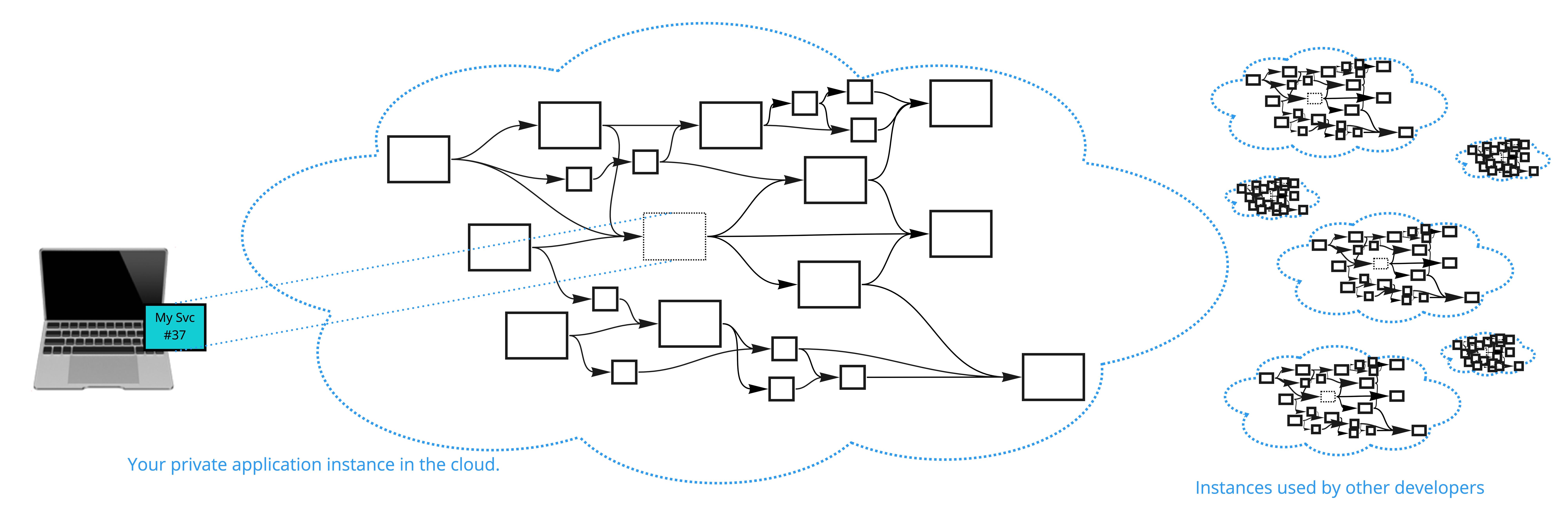 第二个选项解决了其中一些问题。想象一下,能够单击一个按钮并将应用程序的私有版本部署在只有您可以访问的基于云的沙箱中。此沙盒旨在与您的生产环境完全一样。希望它甚至可以使用相同的 Terraform 配置来创建基础设施并将其全部连接起来,但它将使用更小的云实例和更少的实例,因此运行成本不会那么高。然后,您可以将笔记本电脑上运行的服务链接到此开发人员特定的云设置,并使其看起来像是在生产环境中运行。每个开发人员都有自己的应用程序实例,他们可以将其用于测试目的。如图 3 所示。