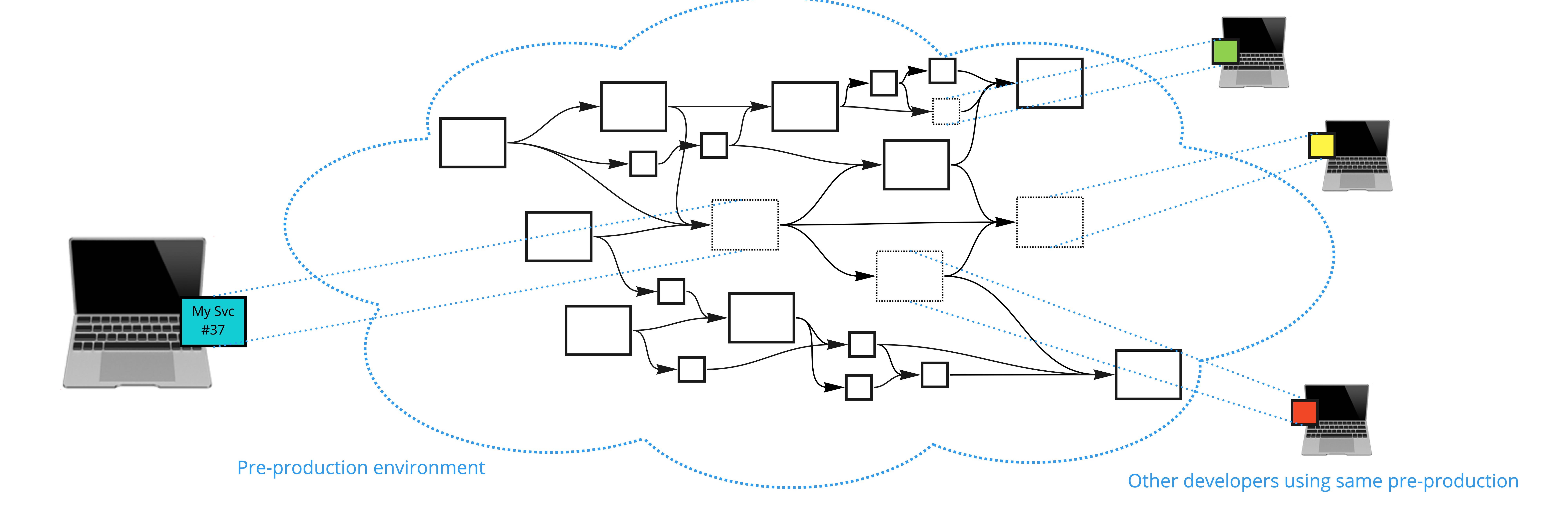 但是,在使用此模型时很有可能测试碰撞。想象一下,如果您正在测试一个服务,而其他人正在测试一个相邻的服务。您可以在测试中做一些影响相邻服务正常运行的事情。您的测试可能会破坏他们的测试。使用此预生产环境的协调变得至关重要、复杂且可能存在问题。
