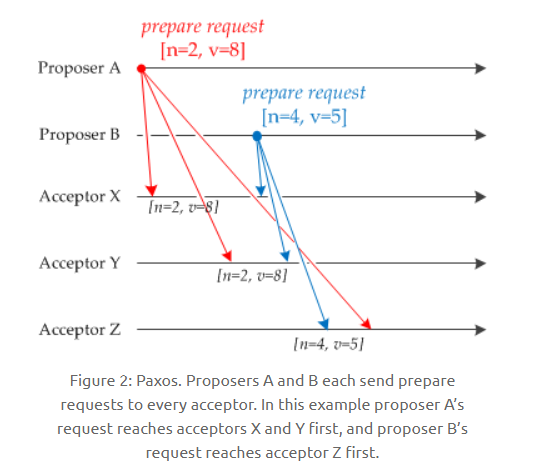 如下图,Acceptor Z 收到 Proposer A 发来的 [n=2, v=8] 的提议请求,由于之前已经接收过 [n=4, v=5] 的提议,并且 n > 2,因此就抛弃该提议请求;Acceptor X 收到 Proposer B 发来的 [n=4, v=5] 的提议请求,因为之前接收到的提议为 [n=2, v=8],并且 2 <= 4,因此就发送 [n=2, v=8] 的提议响应,设置当前接收到的提议为 [n=4,v=5],并且保证以后不会再接受序号小于 4 的提议。Acceptor Y 类似。