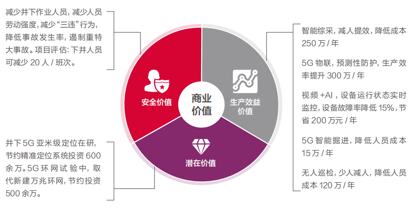 通过 5G+AI 提升生产效率,可减少超过 5 人工的产线巡检,巡检和监控效率提升了 3~4 倍,同时 95% 的概率避免人为和机械事故造成的事故损失。