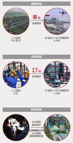 在输变电场景,通过 5G+AI 实现智能巡检, 工作效率提升 80 倍。