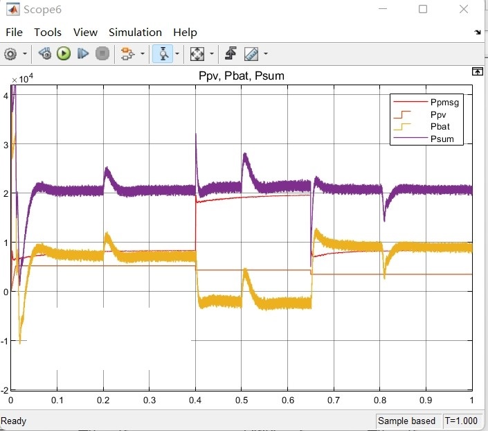 首先,光伏发电系统采用扰动观察法实现最大功率点跟踪(MPPT)控制。该方法通过对光伏阵列输出电压和电流的扰动观察,实时计算出光伏阵列的等效电阻,并通过控制电压转换器(boost电路)的占空比来使得光伏系统的输出功率最大化。通过boost电路将光伏系统的输出并入直流母线。