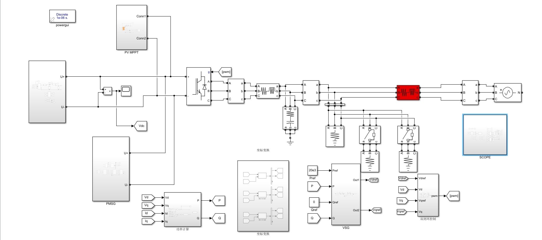 而并网逆变器采用虚功容量控制(VSG)策略,通过对逆变器输出的有功功率(Pref)和无功功率(Qref)进行控制,将直流母线上的电能转换为交流电能,并通过lc滤波器将其并入大电网。在本系统中,逆变器的Pref设置为20kW,Qref为0var。