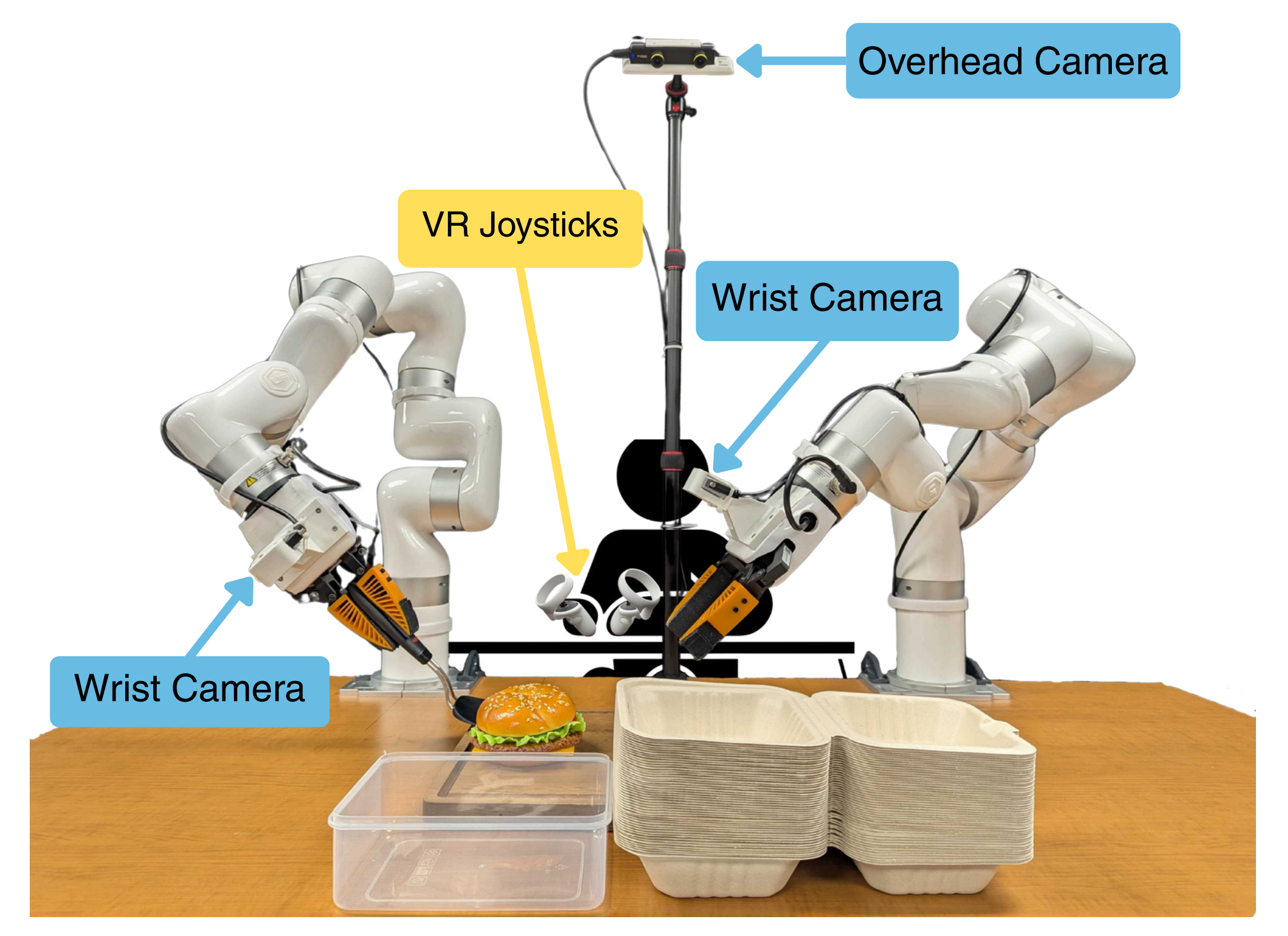- 为了实现响应式控制,中央服务器以60Hz的频率同步并发布来自顶视摄像头和两个腕部摄像头的RGB图像流、机器人状态以及动作指令