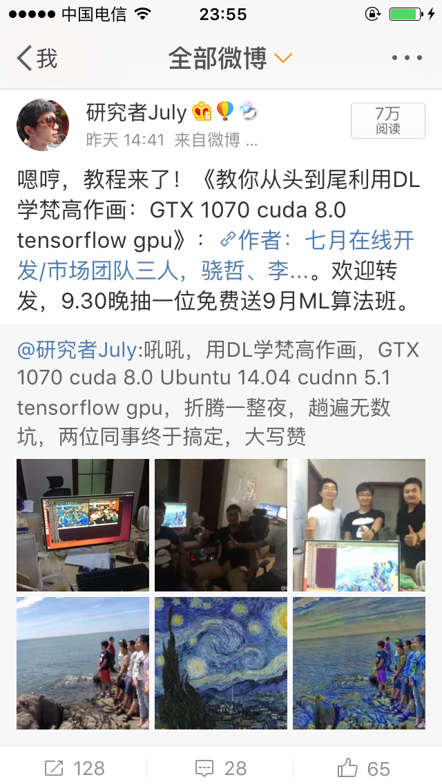 - 22号早上8点,用DL学梵高作画,GTX 1070 cuda 8.0 Ubuntu 14.04 cudnn 5.1 tensorflow gpu,折腾一整夜,趟遍无数坑,两位同事一PHP一市场终于搞定。(恩,有人说,PHP是世界上最好的语言)。
