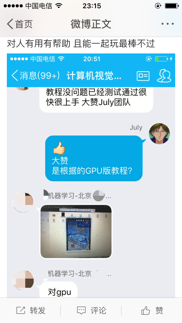 我们搭建好之后,兴高采烈的在微博上发布(因为两同事此前从未搞过DL,可以想象我们心情之兴奋),发现咱5月DL班里一学员之前也搭过这个配置,说:“装cuda 和驱动花了几天,经常出现黑屏”。也有朋友反馈:“配置这玩意确实很麻烦。”、以及“是真的很麻烦,我自己尝试搭建就一直没成功”。所以,很多朋友求教程。