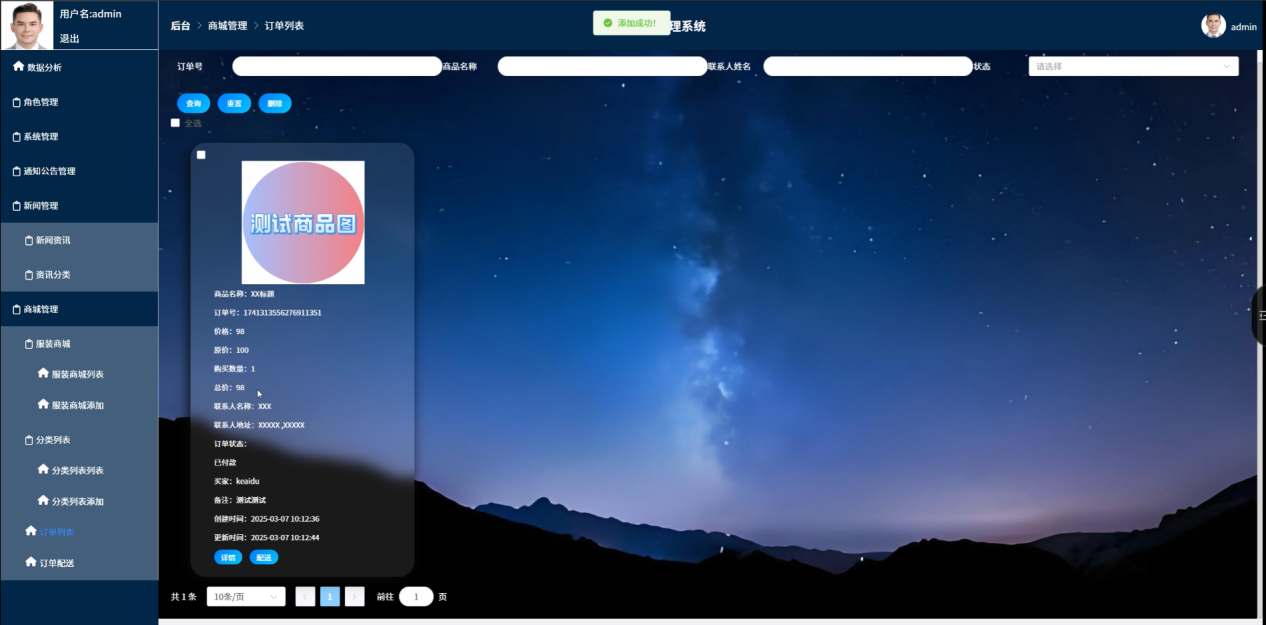 | 点击添加订单配送,必填项合法输入,点击保存 | 提示添加成功 | 与预期结果一致 |