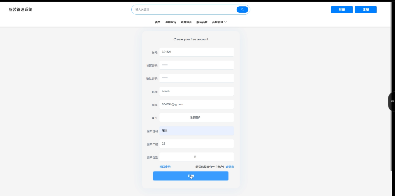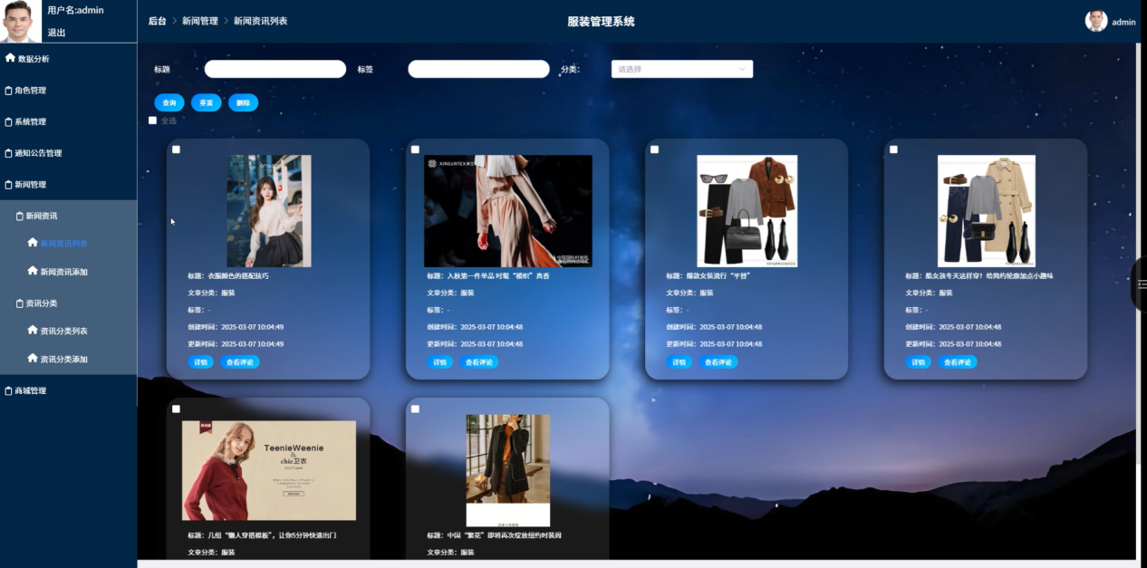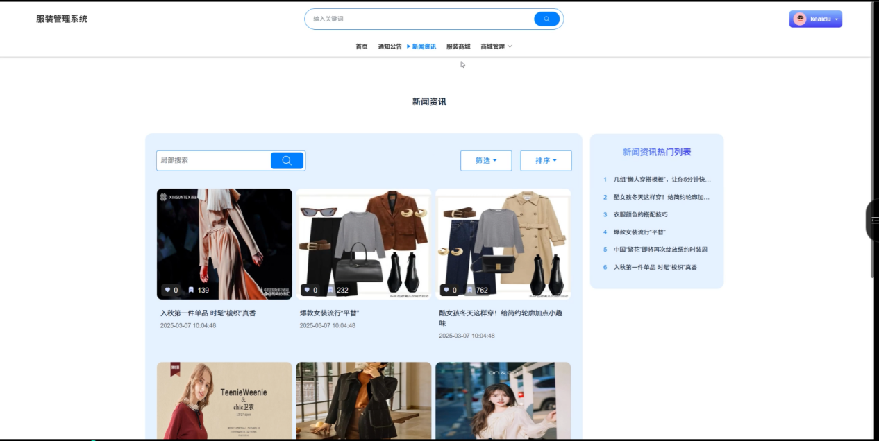 With the rapid development of e-commerce, the management and operation of the clothing industry on the Internet platform has gradually become an important part of the daily life of businesses and consumers. The development of clothing management systems is particularly important to meet the growing market demand. This paper designs and implements a clothing management system based on the Spring Boot framework, aiming to improve the management efficiency and service quality of the clothing industry through information technology. The system consists of two major user roles: administrator and registered user, each with different functional modules. Administrators can perform data analysis, role management, system settings, notification and announcement management, news and information management, and other operations through the backend system, responsible for the daily operation and maintenance of the entire mall. At the same time, the management functions of the mall, such as clothing product management, order management, and delivery, have also been effectively integrated. Registered users can browse and purchase clothing products, view news and information, manage personal accounts, and enjoy a convenient shopping experience through the system.