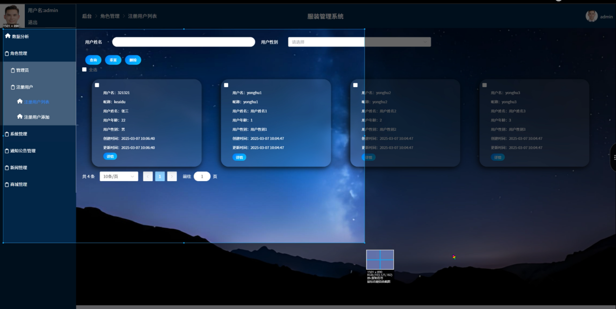 随着电子商务的迅速发展,服装行业在互联网平台上的管理和运营逐渐成为商家和消费者日常生活的重要组成部分。为满足日益增长的市场需求,服装管理系统的开发显得尤为重要。本论文基于Spring Boot框架设计并实现了一套服装管理系统,旨在通过信息化手段提升服装行业的管理效率和服务质量。系统包括两大用户角色:管理员和注册用户,分别具备不同的功能模块。管理员可通过后台系统进行数据分析、角色管理、系统设置、通知公告管理、新闻资讯管理等操作,负责整个商城的日常运作和维护。同时,商城管理功能如服装商品管理、订单管理和配送等也得到了有效整合。注册用户则可通过系统浏览和购买服装商品、查看新闻资讯、管理个人账户等,享受便捷的购物体验。
