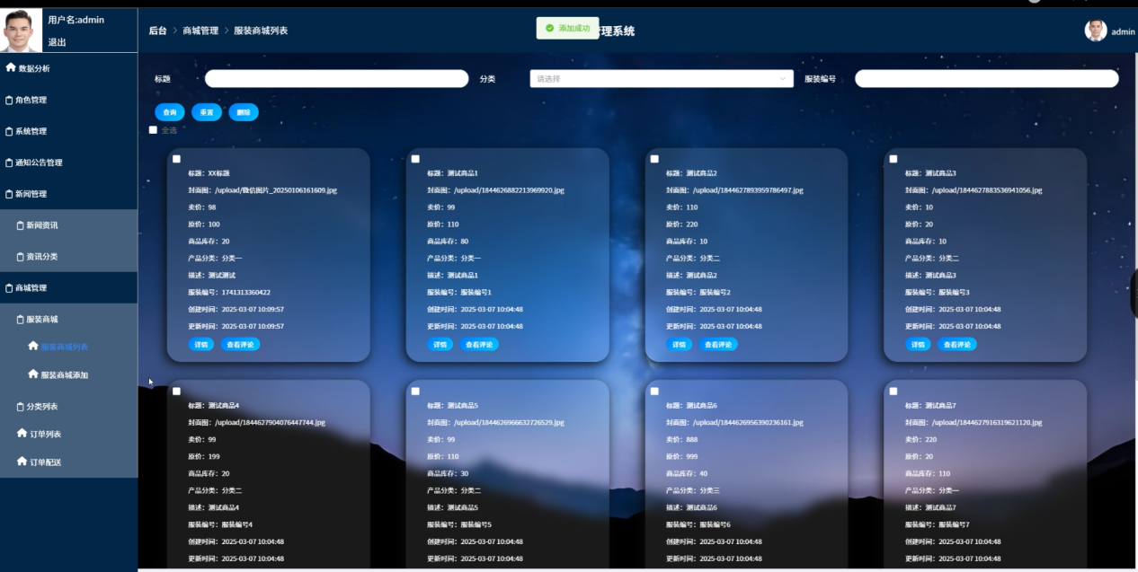 | 点击添加服装商城,必填项合法输入,点击保存 | 提示添加成功 | 与预期结果一致 |