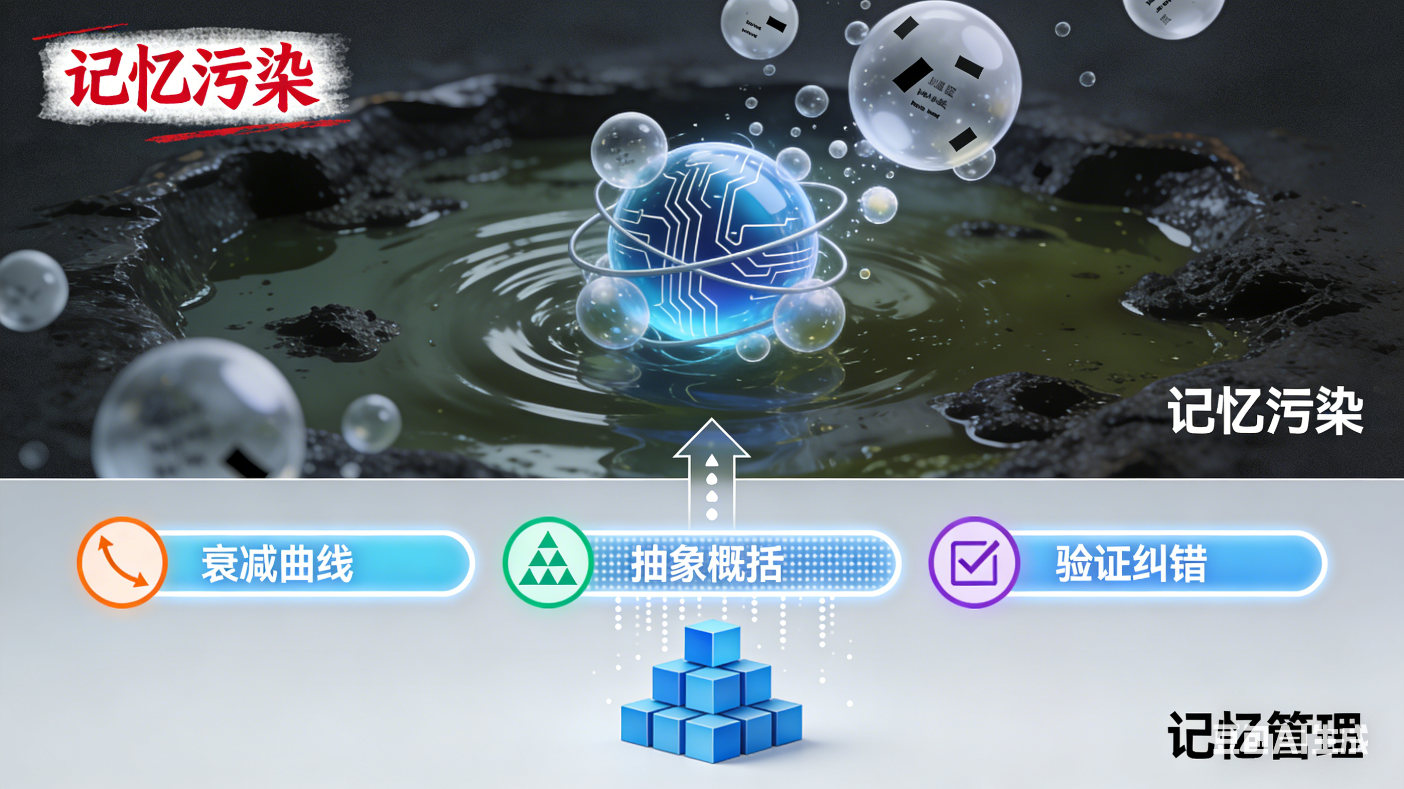 问题核心在于:未经管理的记忆积累会形成“记忆污染”。旧策略、过时信息、错误案例与最新知识混杂在一起,使智能体陷入“记忆沼泽”。