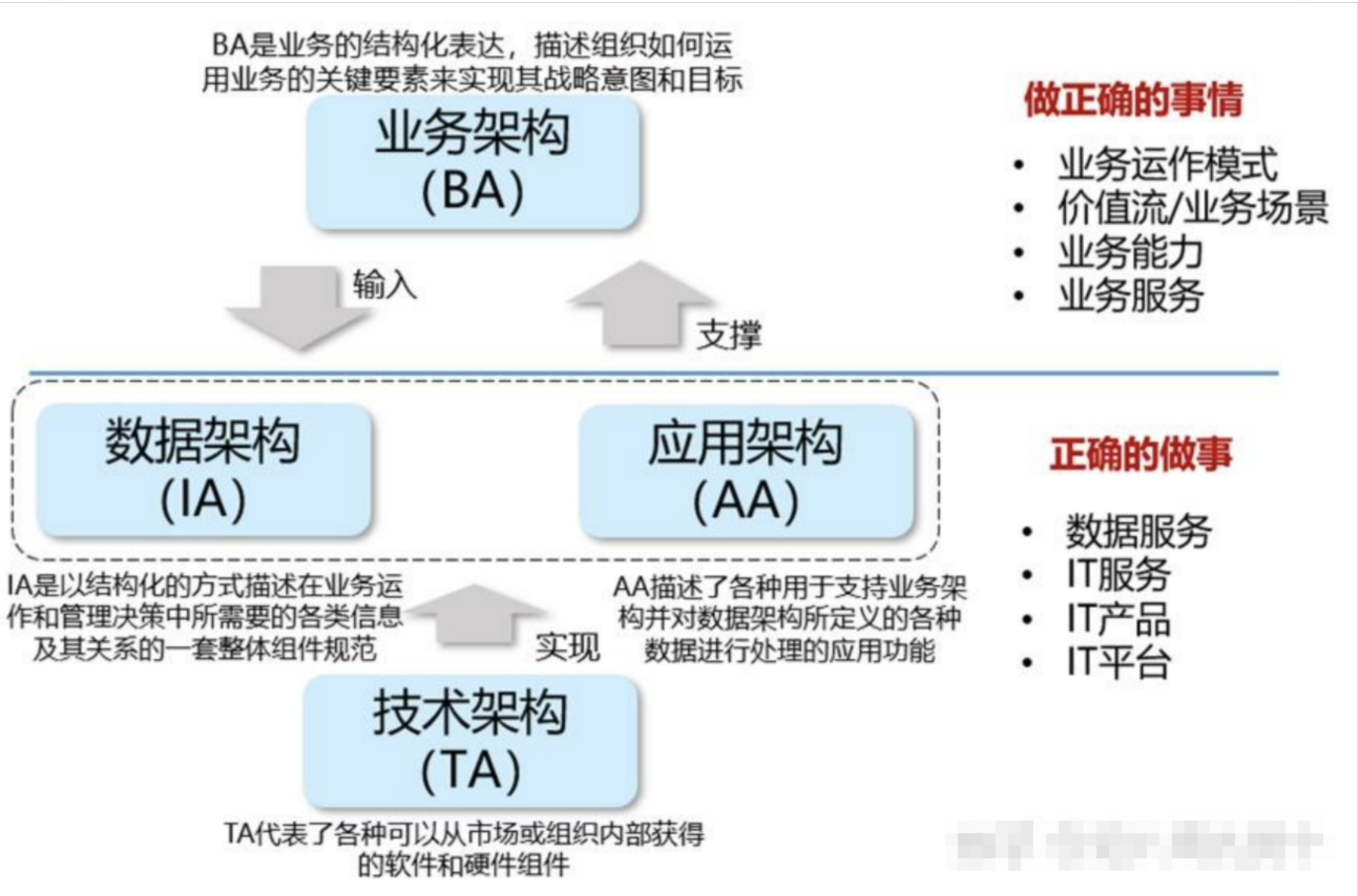 企业架构主要包括业务架构、信息/数据架构、应用架构、技术架构四大部分。