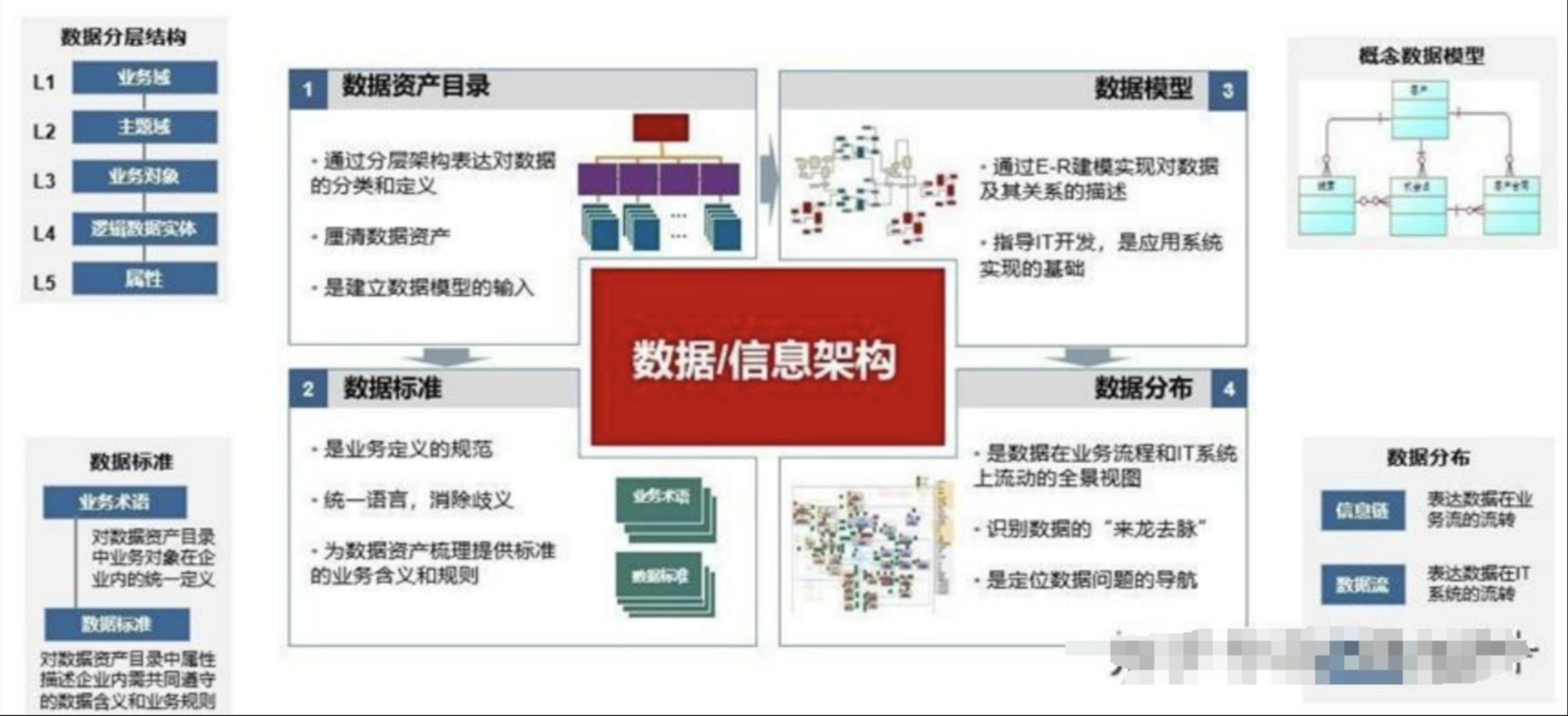 1、信息(数据)架构定义:数据架构是企业架构的一部分,企业级数据架构是以结构化的方式描述在业务运作和管理决策中所需要的各类数据及其关系的一套整体组件规范。包括数据资产目录、数据标准、企业级数据模型和数据分布四个组件。