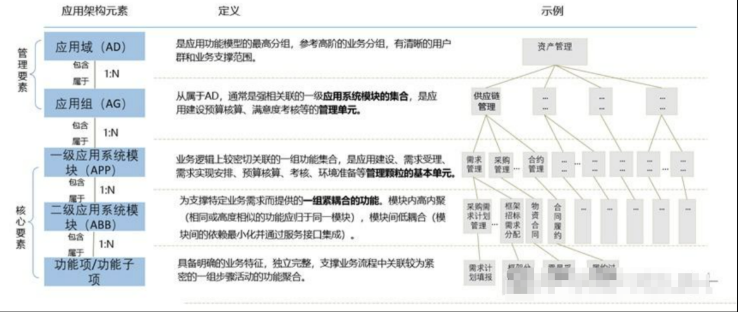 2、应用架构元素:包括应用域、应用组、一级应用模块、二级应用模块、功能/子功能。