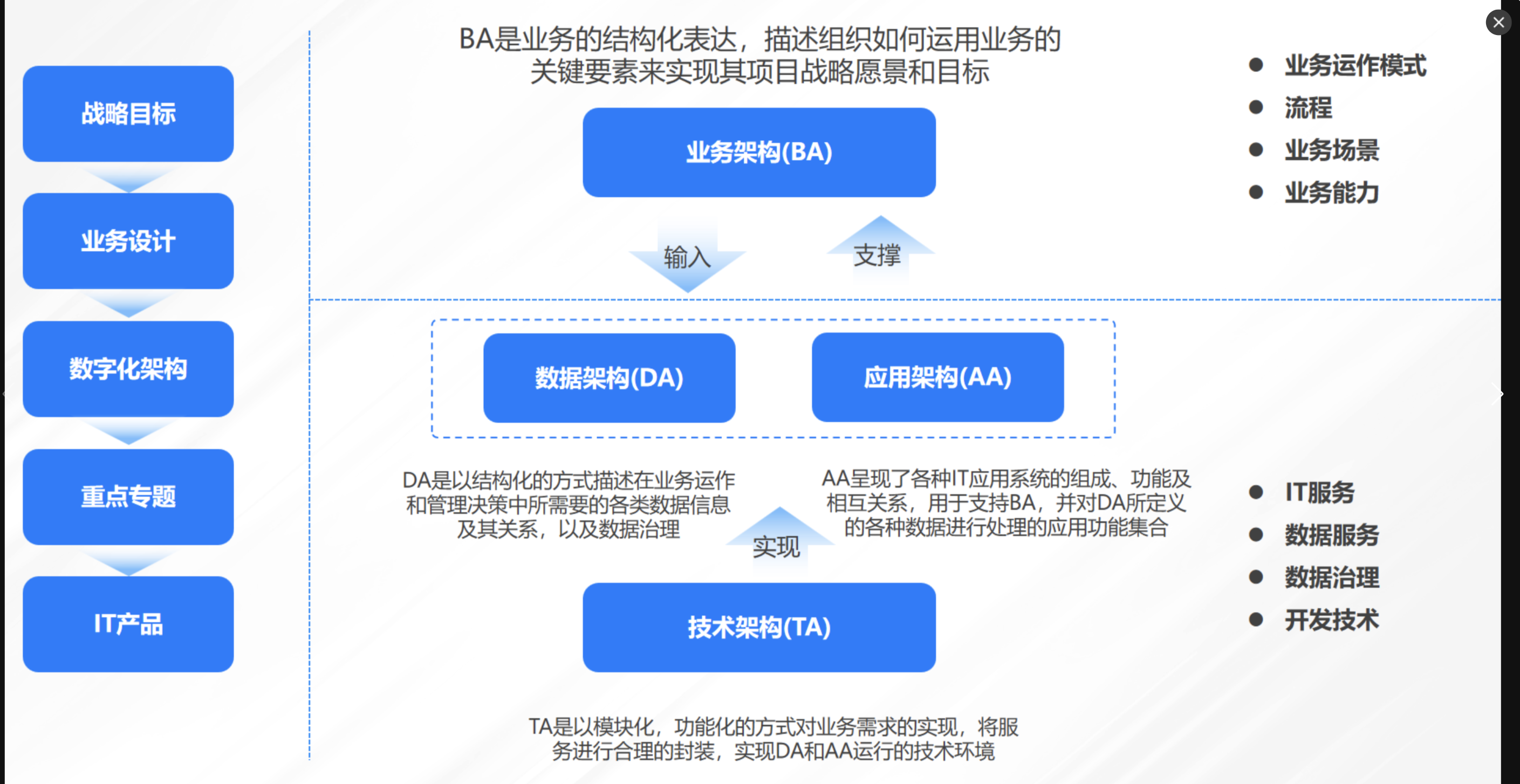 2、业务架构定义:业务架构(Business Architecture,简称BA)是业务的结构化表达,描述组织如何运用业务的关键要素来实现其战略意图和目标。