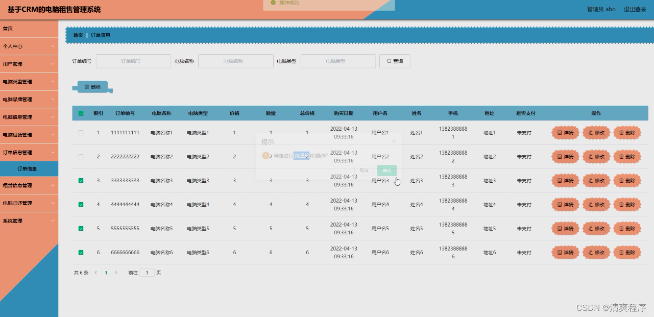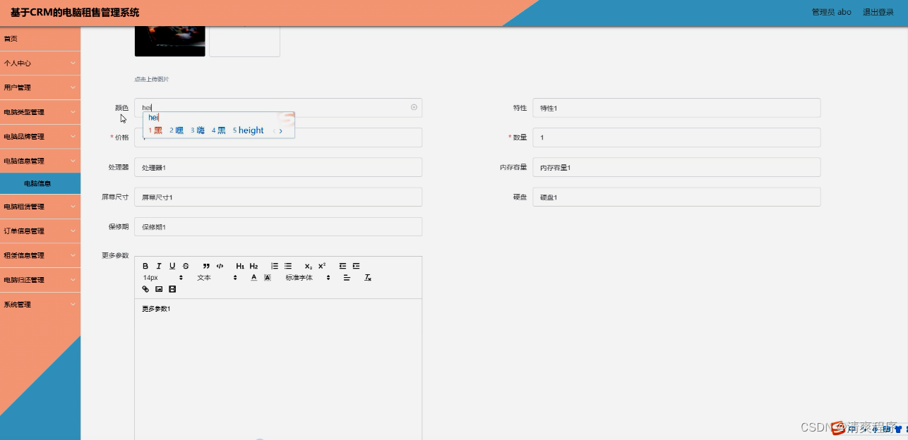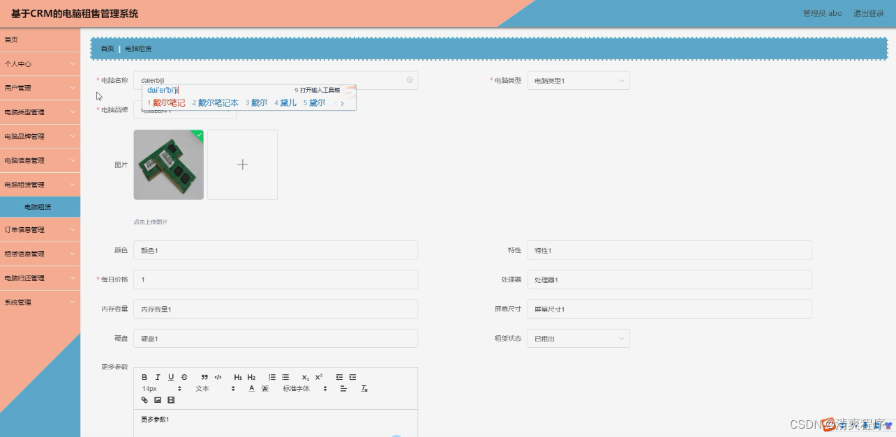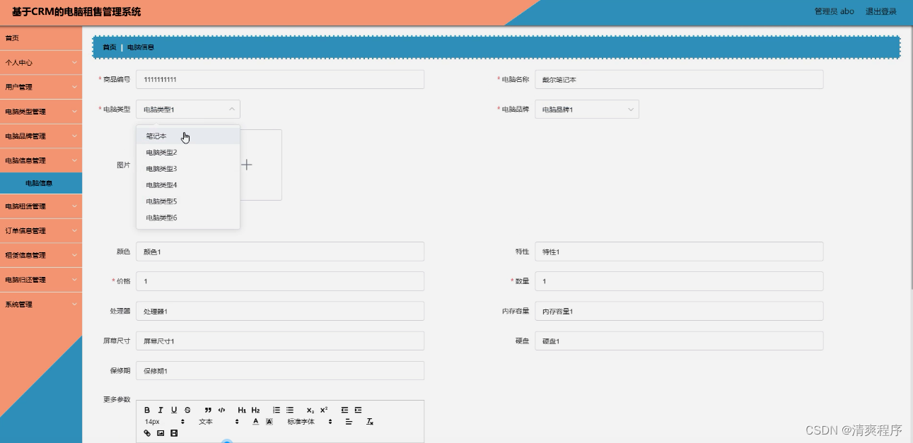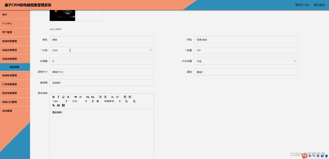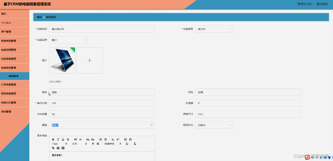 选题背景: 在当今信息化快速发展的时代,电脑作为日常工作和学习的重要工具,其需求量日益增长。随着互联网技术的发展,越来越多的企业和个人选择通过在线渠道进行电脑的租售业务。然而,传统的电脑租售管理方式存在着信息不对称、管理效率低下、客户关系维护困难等问题。为了提高电脑租售行业的管理效率和客户满意度,基于客户关系管理(CRM)系统的电脑租售管理系统应运而生。该系统利用前端技术HTML、CSS、JavaScript和Vue框架,结合后端技术Node.js和Express框架,以及MySQL数据库,实现了一个高效、便捷的电脑租售管理平台。