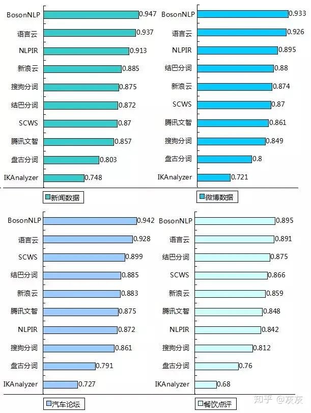 分词数据准备及评测由BosonNLP完成:11 款开放中文分词引擎大比拼(2015年发布)