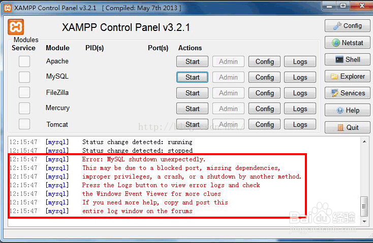 12:15:47 [mysql] Press the Logs button to view error logs and check