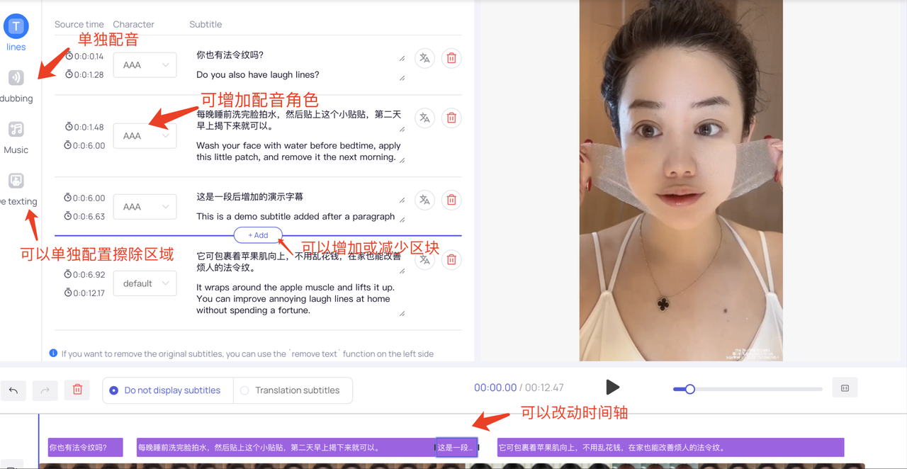 鬼手剪辑推出的视频翻译手工版,可以支持一站式的完成上述工作。你可以在鬼手剪辑先对视频进行字幕提取和翻译,然后再对译后字幕校准、确定样式、确定角色并选择语音、配置擦除细节后,再生成作品。先校准再生成,一站式操作,操作很简单,翻译很专业。鬼手剪辑产品特别支持了对多角色的识别和标记,并即将支持对每个角色进行克隆配音。影视出海、综艺节目、教育培训的有福啦。