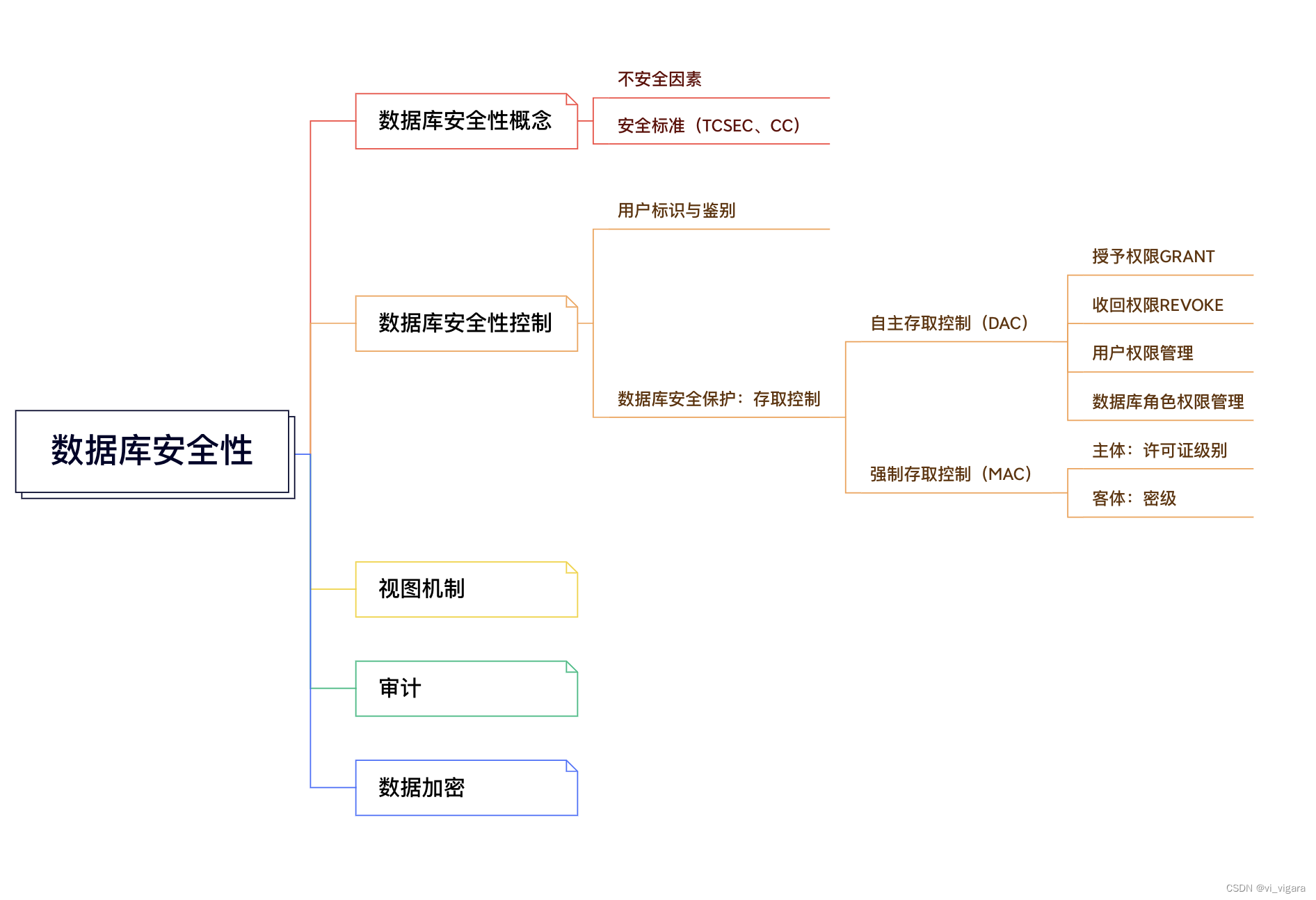 【自用】Chapter_4_数据库安全性 一、数据安全性概念1、数据库安全性:保护数据库以防止不合法使用造成的数据泄露、更改和破坏2、数据库的三类安全问题:技术安全 管理安全 政策法律安全3、数据库的不安全因素:非授权用户对数据库的恶意存取和破坏 数据库中重要或敏感的数据被泄露 安全环境的脆弱性4、安全标准(重点学习TCSEC和CC两个标准)(1)TCSEC(Trusted Computer System Evaluation Criteria)《DoD可信计算机系统评估标准》从四个方面来描述安..