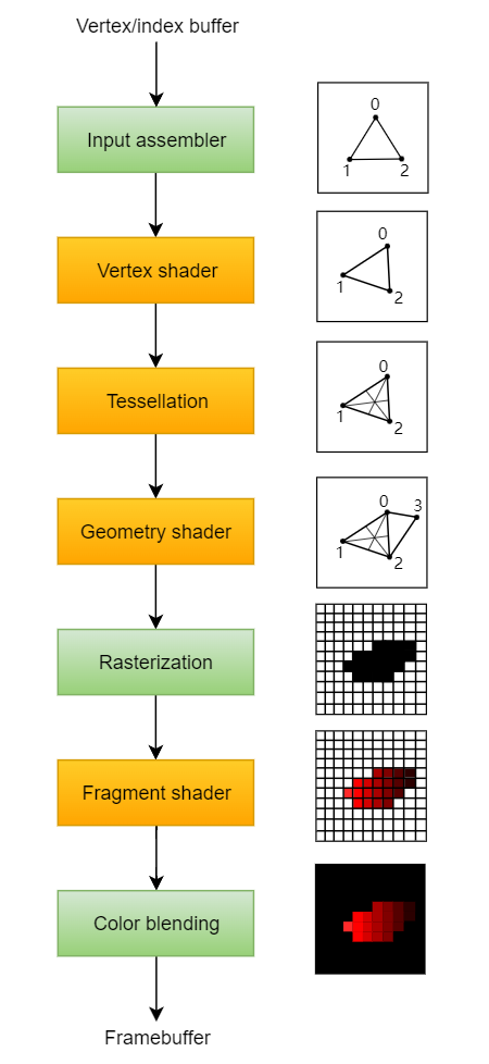 Over the course of the next few chapters, we'll be setting up a graphics pipeline that is configured to draw our first triangle. The graphics pipeline is the sequence of operations that take the vertices and textures of your meshes all the way to the pixels in the render targets. A simplified overview is displayed below:
