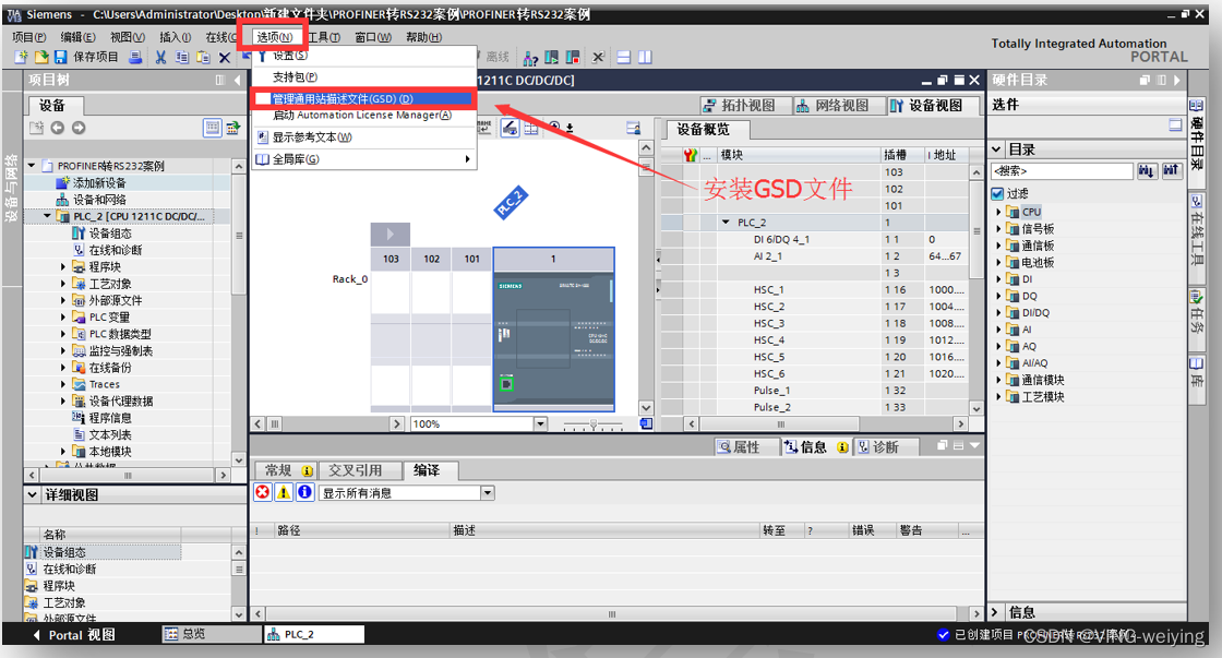 (3)在“选项”窗口选择“管理通用站文件GSD”,安装GSD文件