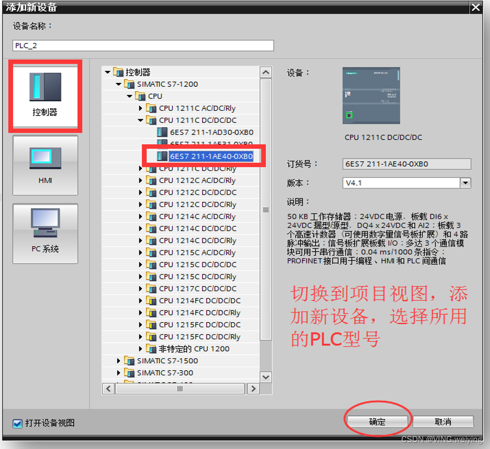 (2)点击添加新设备,本例选取的是西门子PLC1200,选取所应用的PLC型号,点击“确认”,进入硬件组态界面。