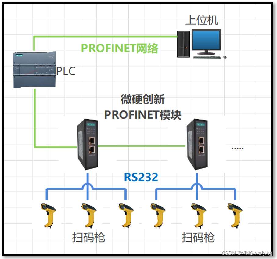 由于PROFINET网络协议逐渐在各种行业中得到广泛应用,随着条码技术的成熟和广泛应用,生产厂家采用条码标识其产品,在生产、库存、发货、销售、售后中采集产品信息,将扫码扫上来的数据要传送在PROFINET网络,就需要借助于微硬创新RS232转PROFINET(PROFINET转RS232)网关或者是MODBUS RS485转PROFINET(PROFINET转MODBUS RS485)