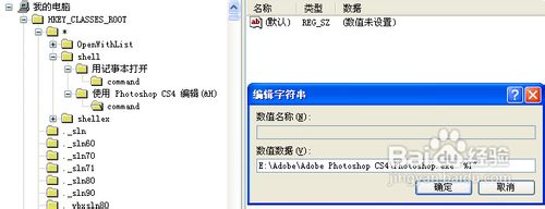 4、确保当前选中的是command项,双击其右侧的(默认),在【编辑字符串】窗口中,输入PS的路径,并追加 %1 ,确定后就完成了~