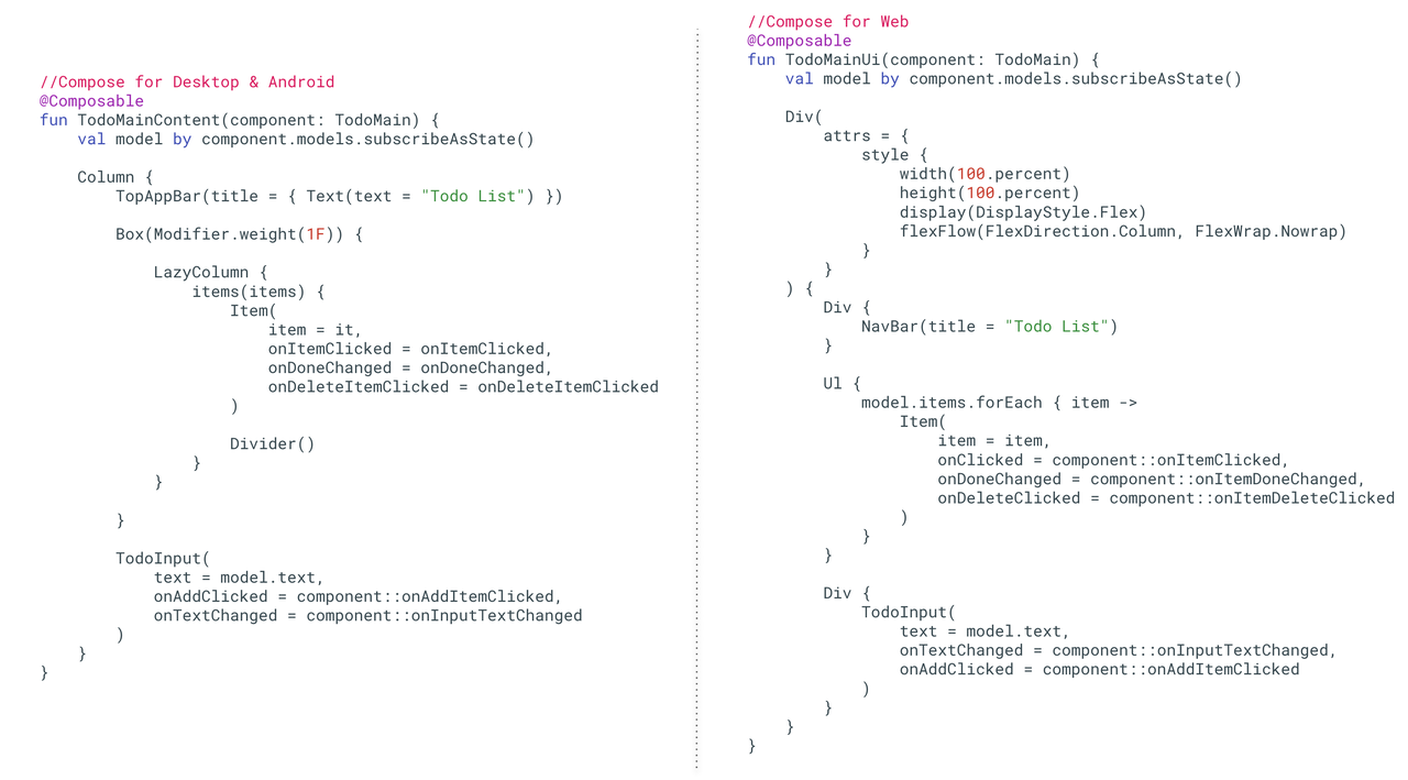 Compose Desktop 与 Jetpack Compose 在代码上没有区别,而 Compose Web 使用 Div,Ul 这样与 HTML 标签同名的 Composable,而且使用 style { …} 这样面向 CSS 的 DSL 替代 Modifier,开发体验更符合前端的习惯。虽然 UI 部分的代码在不同平台有差异,但是在逻辑部分,可以实现完全复用,各平台的 Comopse UI 都使用 component.models.subscribeAsState() 监听状态变化。