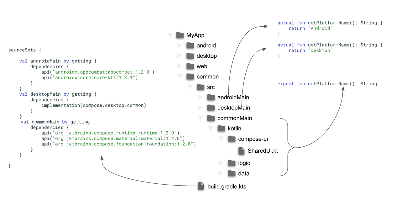 common 文件夹是 KMP 的核心。commonMain 中是完全共享的 Kt 代码,通过 expect/actual 关键字实现平台差异化开发。