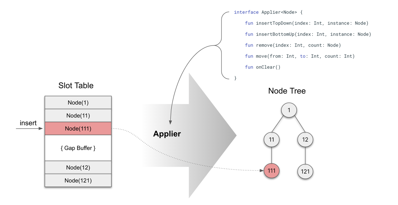 Applier 是一个接口,从接口定义不难看出,它用于对一棵 Node 类型节点树进行增删改等维护工作。以一个 UI 的插入为例,我们在 Compoable 中的一段 if 语句就可以实现一个 UI 片段的插入。if 代码块在编译期会生成一个 ReplaceGroup,当重组中命中 if 条件执行到 startReplaceGroup 时,发现 Slot Table 中缺少 Group 对应 key 的信息,因此可以识别出是一个插入操作,然后插入新的 Group 以及所辖的 Node 信息,并通过 Applier 转换成 Node Tree 中新插入的节点。
