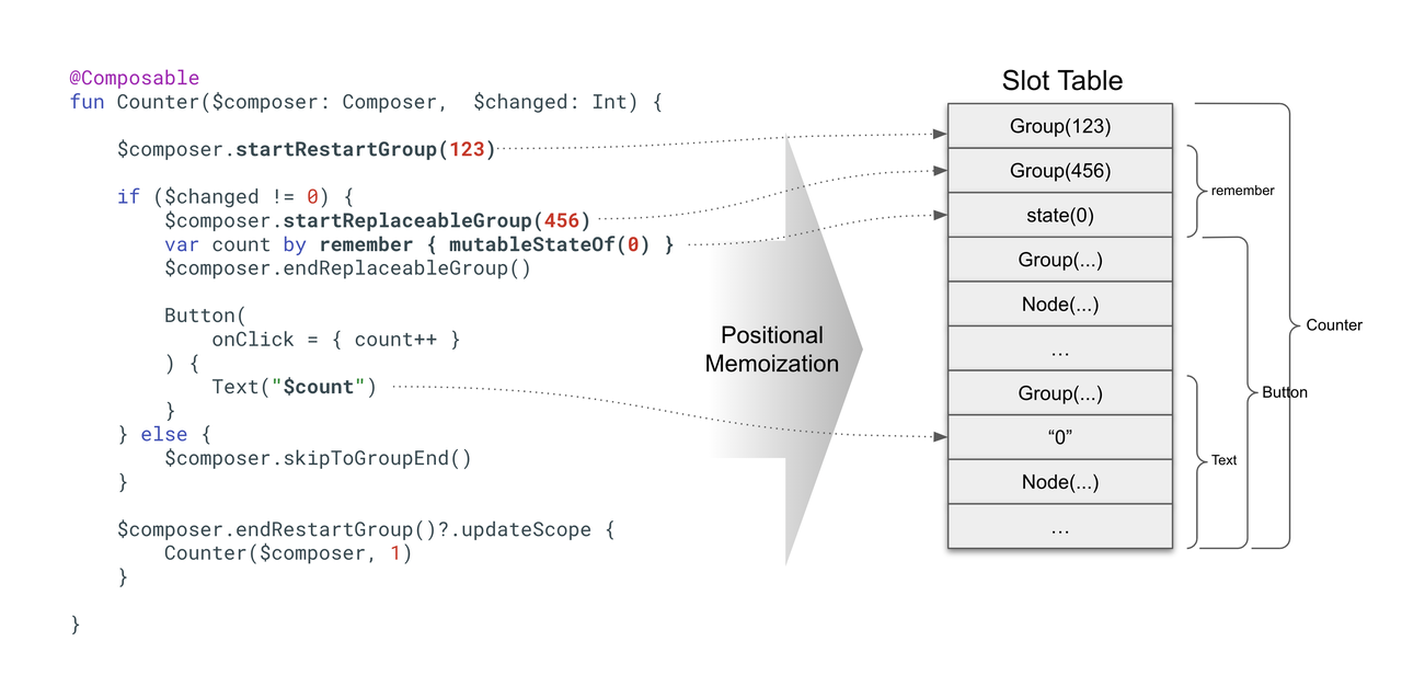 Comopsable 首次执行时,产生的 Group 以及所瞎的状态会以此填充到 Slot Table 中,填充时会附带一个编译时给予代码位置生成的不重复的 key,所以 Slot Table 中的记录也被称作基于代码位置的存储(Positional Memoization)。当重组发生时, Composable 会再次遍历 SlotTable,并在 startXXXGroup 中根据 key 访问当前代码所需的状态,比如 count 就可以通过 remember 在重组中获取最近的值。